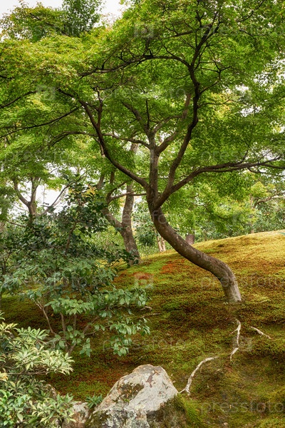 Клен в парке, покрытый мхом (добаси) в храме Кинкаку-дзи. Киото. Япония