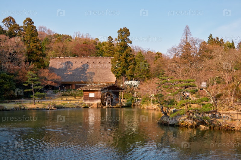 Водяная мельница на берегу пруда Окуйке в зоопарке и ботаническом саду Хигасияма. Нагоя. Япония