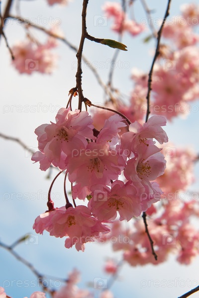 Розовые вишневые цветы сакуры на фоне голубого неба. Япония