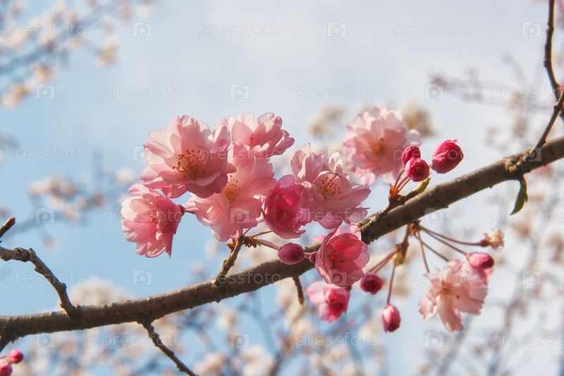Розовые вишневые цветы сакуры на фоне голубого неба. Япония