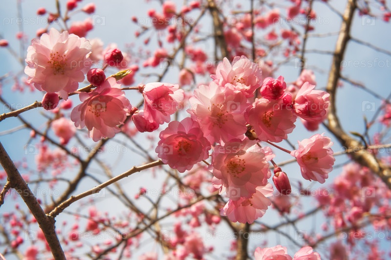 Розовые вишневые цветы сакуры на фоне голубого неба. Япония