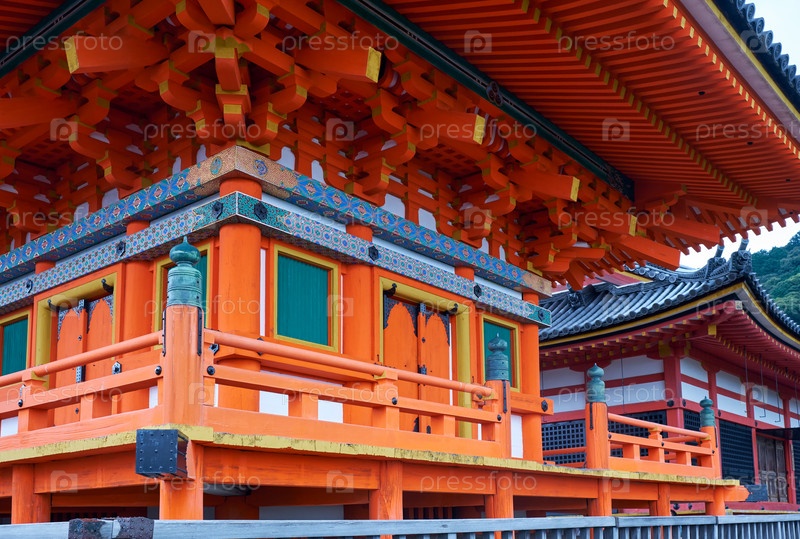 Близкий вид на трехэтажную пагоду Сандзю-но-то и Ке-до храма Киемидзу-дэра. Киото. Япония