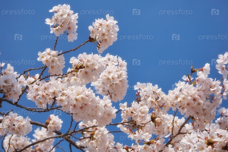 Белые вишневые цветы сакуры на фоне голубого неба. Япония