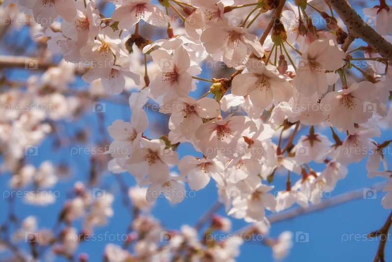 Белые вишневые цветы сакуры на фоне голубого неба. Япония