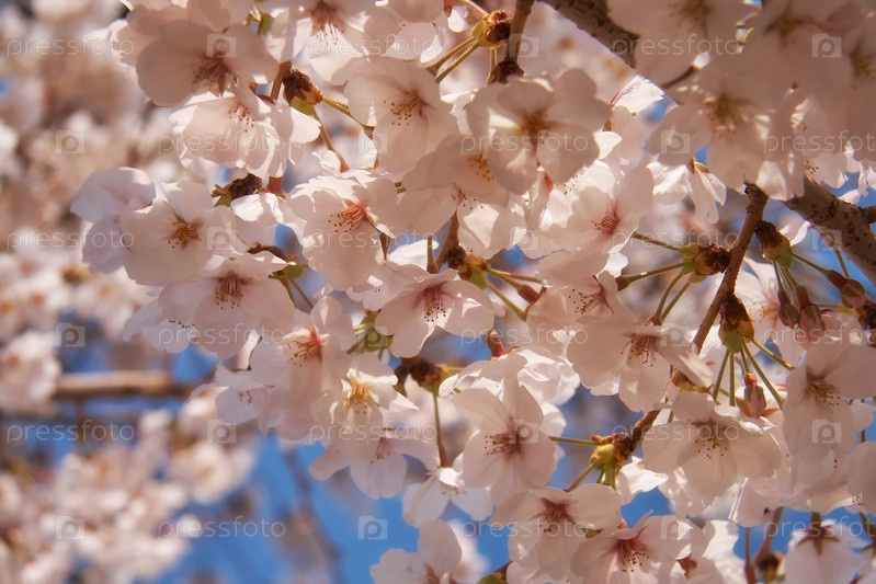 Белые вишневые цветы сакуры на фоне голубого неба. Япония
