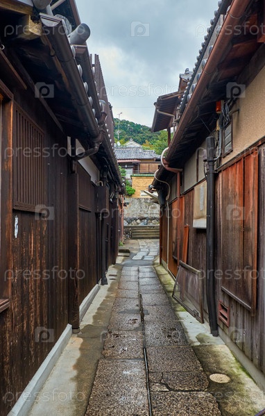 Небольшая узкая улочка, окруженная типичными для Киото зданиями матия. Хигасияма. Киото. Япония