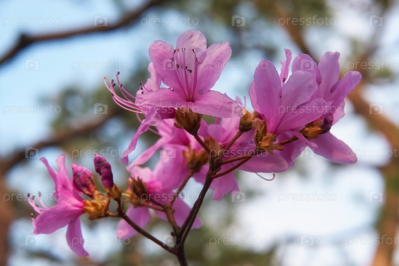 Фиолетовые цветки рододендрона в контровом свете. Япония