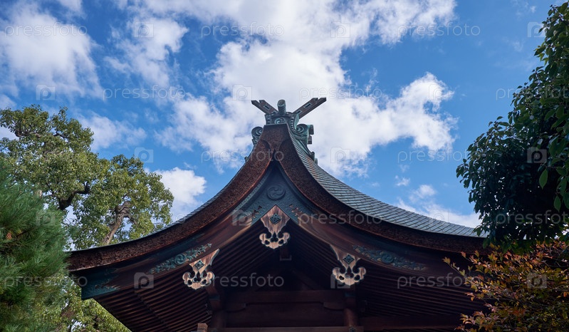 Крыша из коры кипариса храма Сикити-дзиндзя хондэн украшена чиги и кацуоги. Киото. Япония