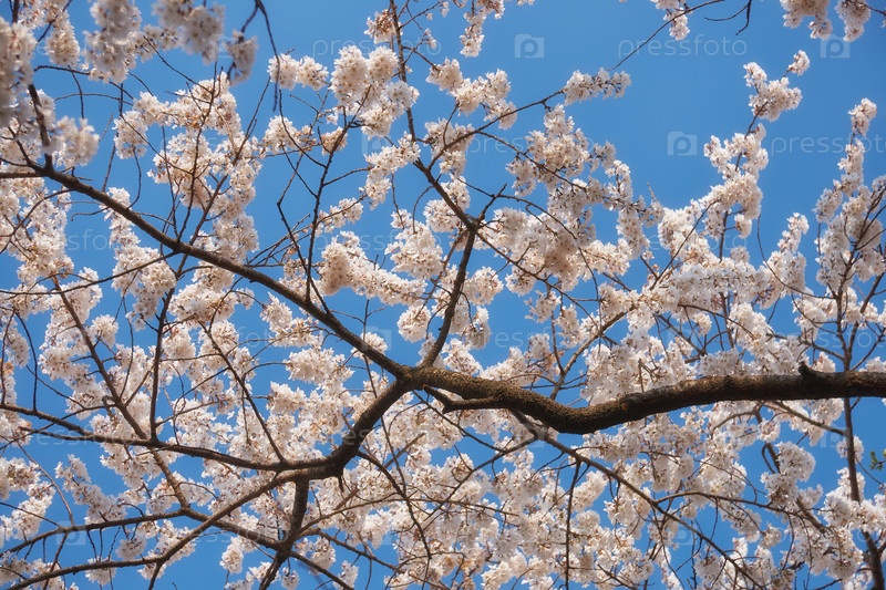 Белые вишневые цветы сакуры на фоне голубого неба. Япония