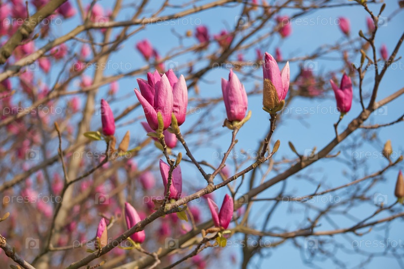 Фиолетовые японские магнолии цветут весной. Япония