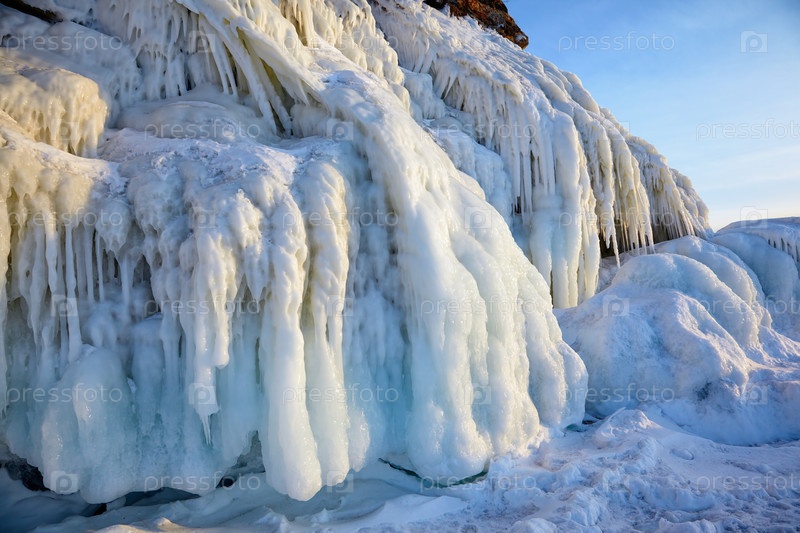 Скалы, покрытые льдом на зимнем Байкале