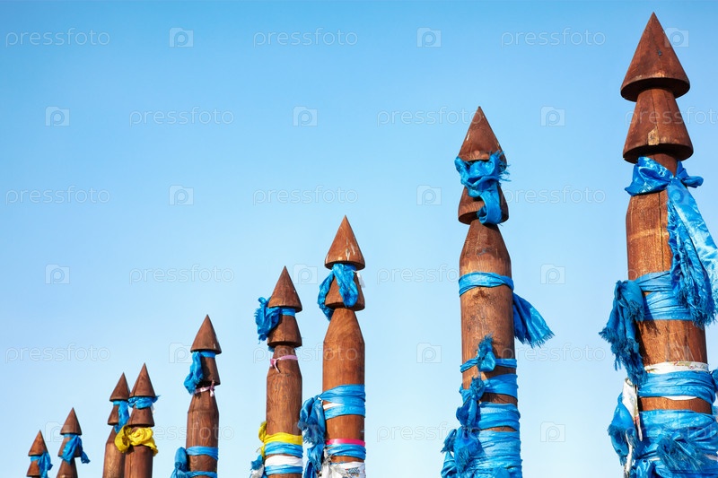 Деревянные шаманские тотемы с лентами