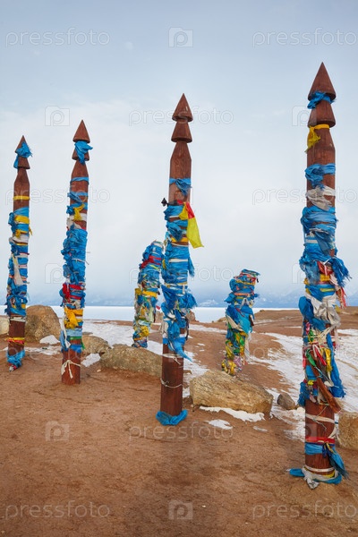 Деревянные шаманские тотемы с лентами