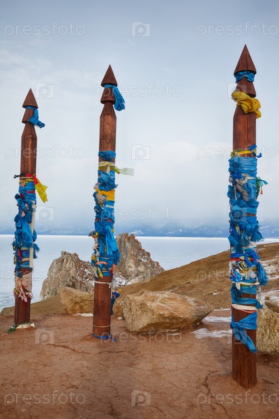 Деревянные шаманские тотемы с лентами