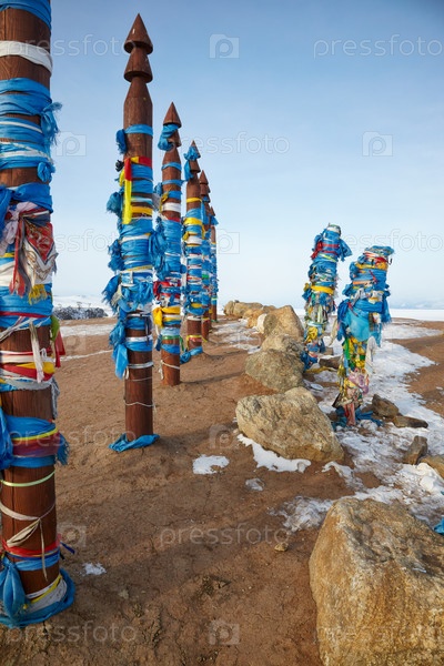 Деревянные шаманские тотемы с лентами