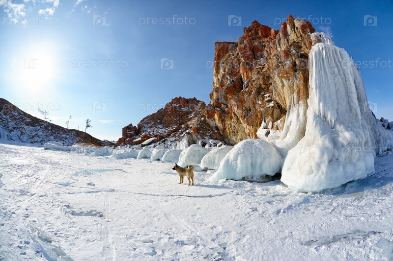 Скалы, покрытые льдом на зимнем сибирском озере Байкал