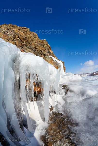 Скалы, покрытые льдом на зимнем сибирском озере Байкал