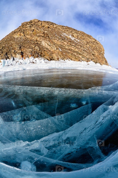 Скалы, вмерзшие в лед озера Байкал зимой