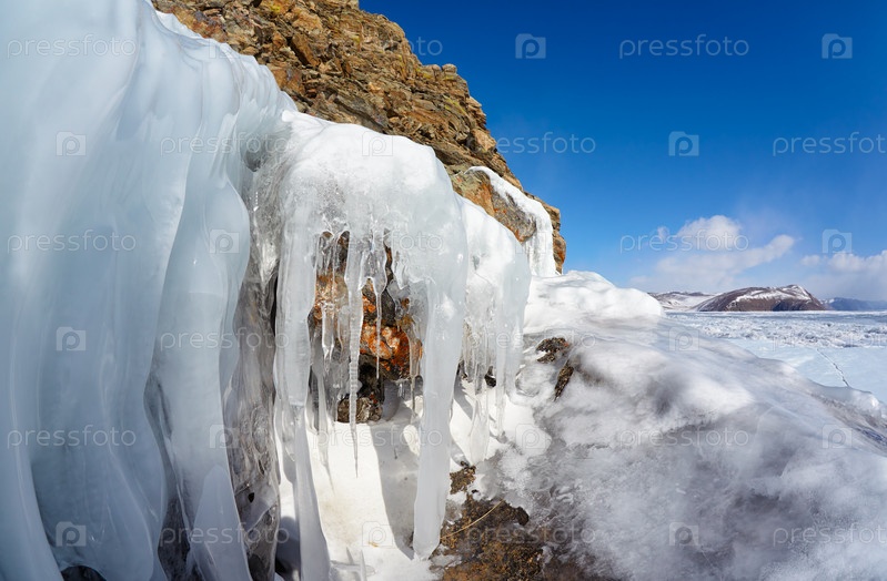 Скалы, покрытые льдом на зимнем сибирском озере Байкал