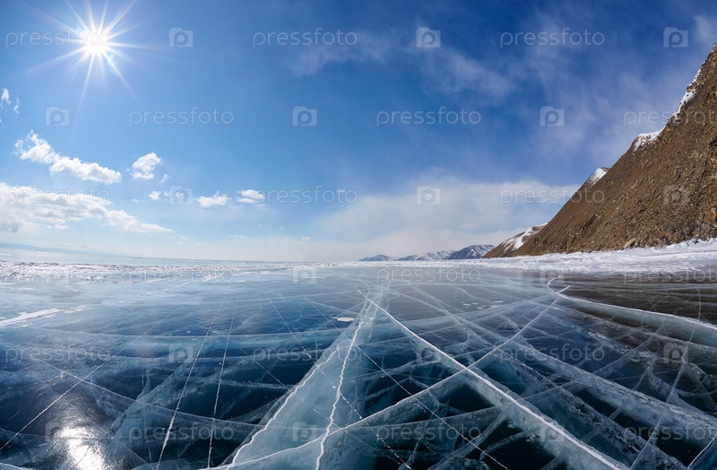Зимний ледяной пейзаж на сибирском озере Байкал с облаками
