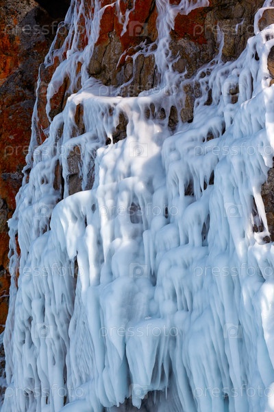 Лед над каменной стеной на озере Байкал зимой