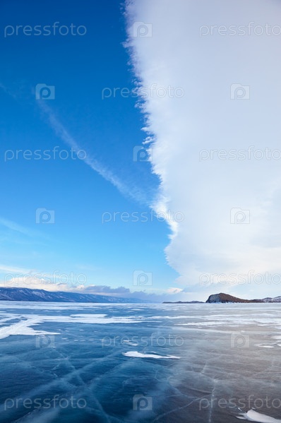Зимний ледяной пейзаж на озере Байкал с драматическими погодными облаками перед штормом