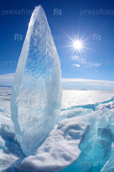 Льдина и солнце на зимнем озере Байкал