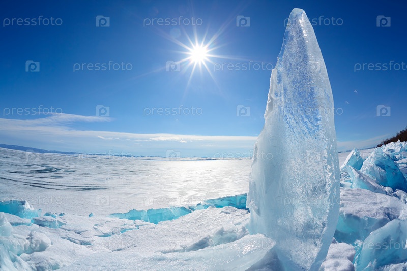 Льдина и солнце на зимнем озере Байкал