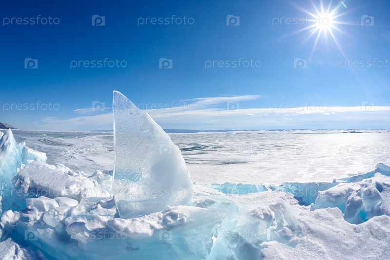 Льдина и солнце на зимнем озере Байкал