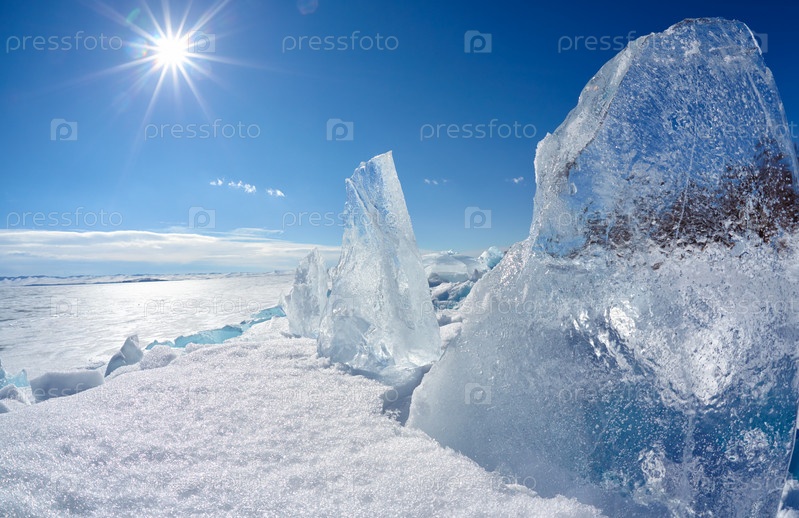 Льдина и солнце на зимнем озере Байкал