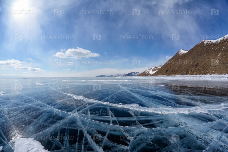 Зимний ледяной пейзаж на сибирском озере Байкал с облаками