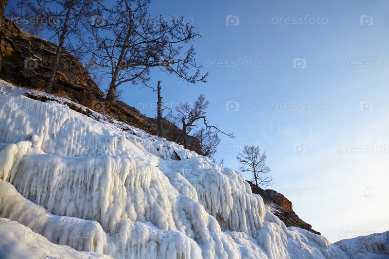 Скалы, покрытые сосульками на зимнем Байкале