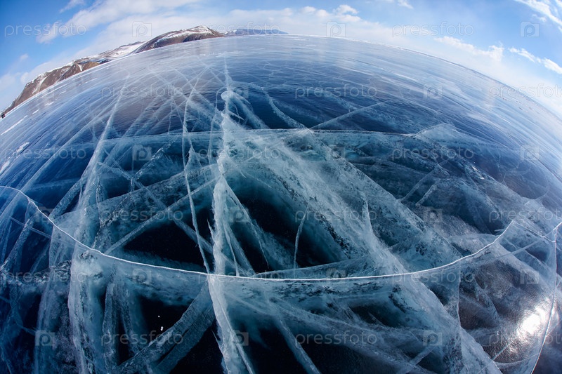 Зимний ледяной пейзаж на сибирском озере Байкал с облаками