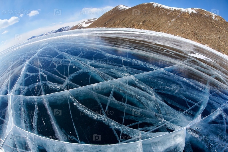Зимний ледяной пейзаж на сибирском озере Байкал с облаками
