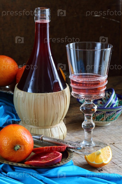 Восточный натюрморт с красным вином и апельсинами на деревянном фоне