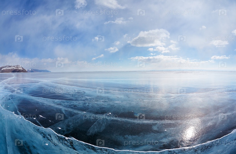 Зимний ледяной пейзаж на сибирском озере Байкал с облаками