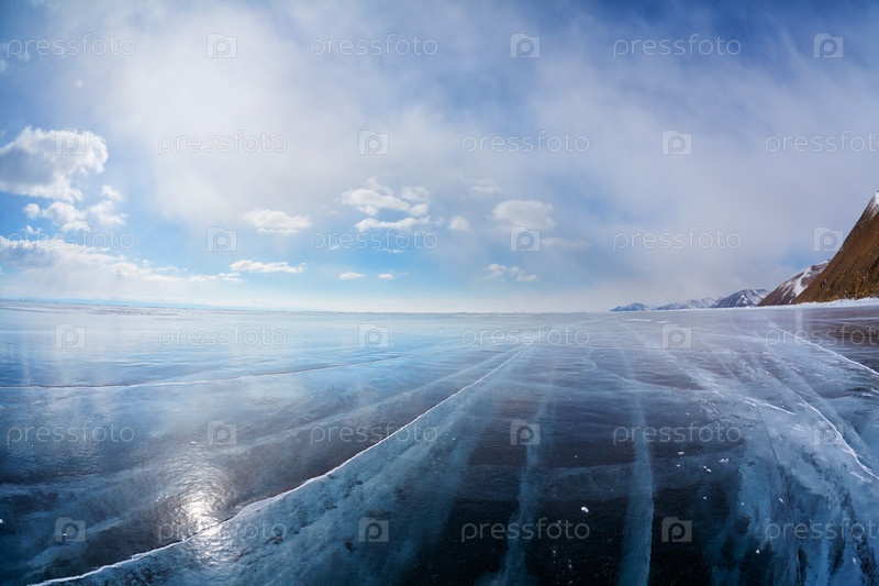 Зимний ледяной пейзаж на сибирском озере Байкал с облаками