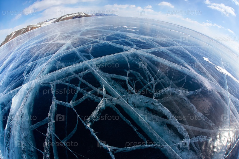Зимний ледяной пейзаж на сибирском озере Байкал с облаками