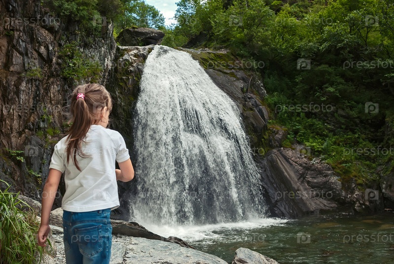 Маленькая девочка в белой футболке и синих джинсах стоит спиной к зрителю рядом с большим горным водопадом. Водопад Корбу. Горный Алтай