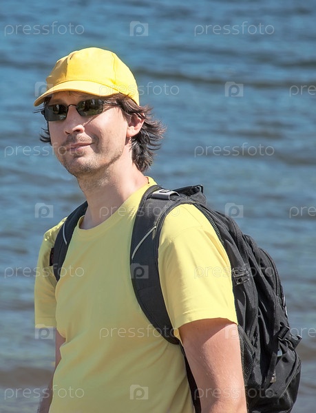 Мужчина в солнцезащитных очках, в желтой бейсболке и желтой футболке с рюкзаком