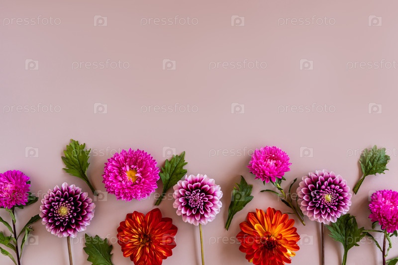 Яркая осенняя кайма из цветов и листьев, срезанных в саду. вид сверху. плоская планировка. копия пространства. открытка. бежевый фон