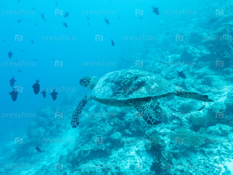 Большая зеленая черепаха плавает в глубинах Индийского океана, Мальдивские острова