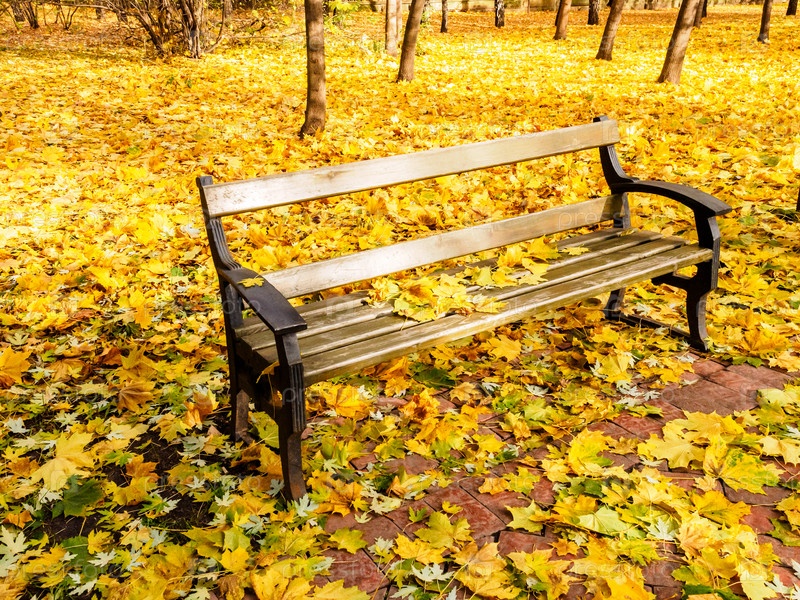 Коричневая деревянная скамейка в осеннем красивом парке с желтыми кленовыми листами
