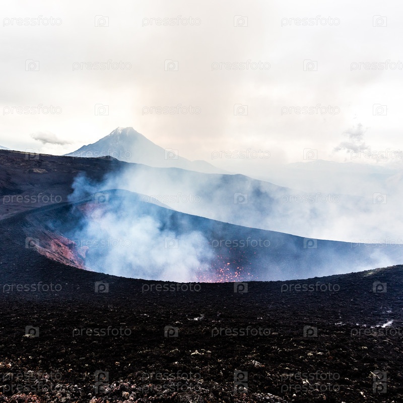 Кратер извергающегося вулкана. Красная горячая лава летит из жерла вулкана