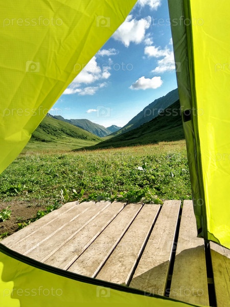 Вид изнутри желтой палатки на деревянной платформе