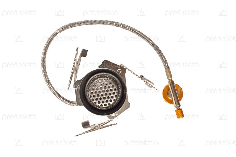 Вид сверху на кемпинговую газовую плиту для приготовления пищи на белом фоне