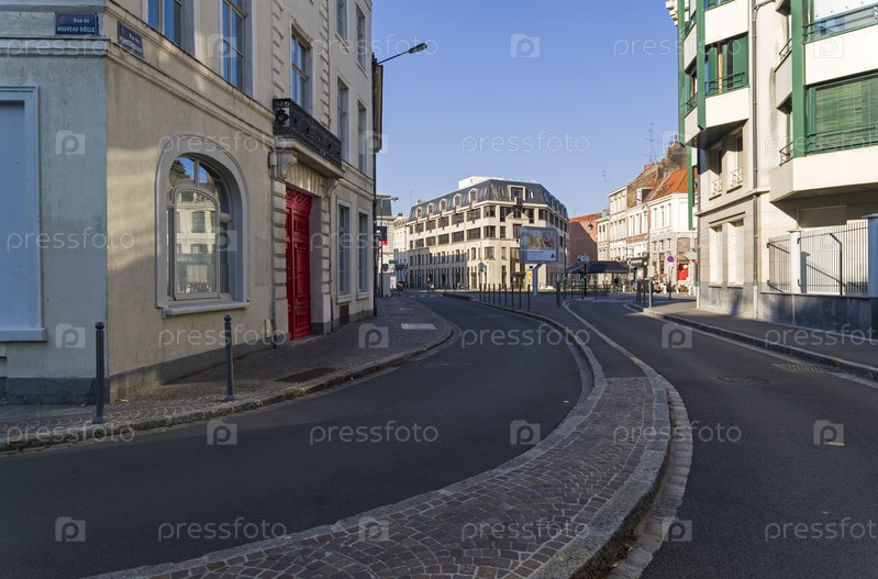 Маленькая изогнутая улица в центре города. Лилль, Франция. Солнечный день в начале сентября