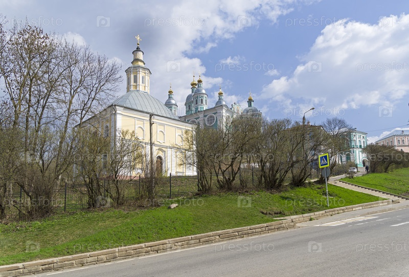 Соборная гора в Смоленске. Благовещенская церковь и Успенский кафедральный собор. Конец апреля, солнечно