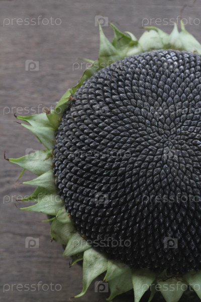 Подсолнух с черными семечками на деревянном фоне, сбор урожая. Вертикальное фото