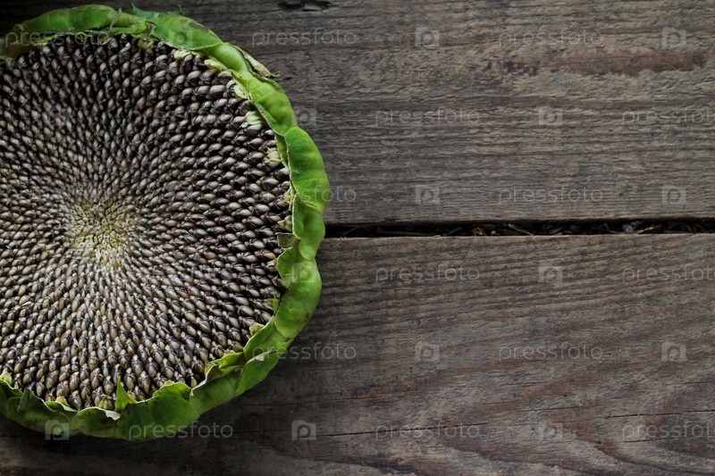 Подсолнух с черно-белыми семечками на деревянном фоне, сбор урожая. Место для текста